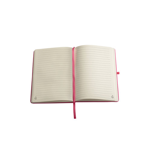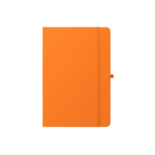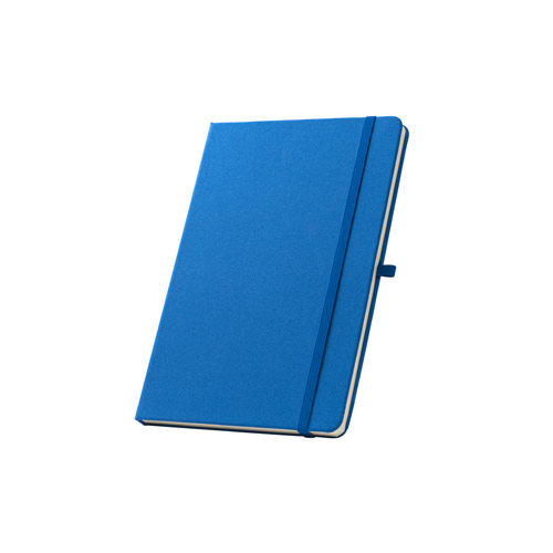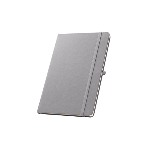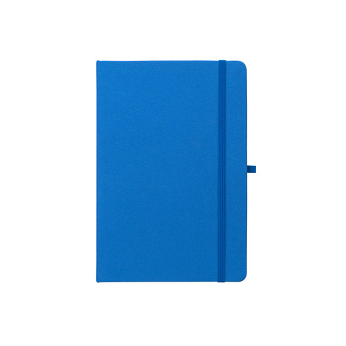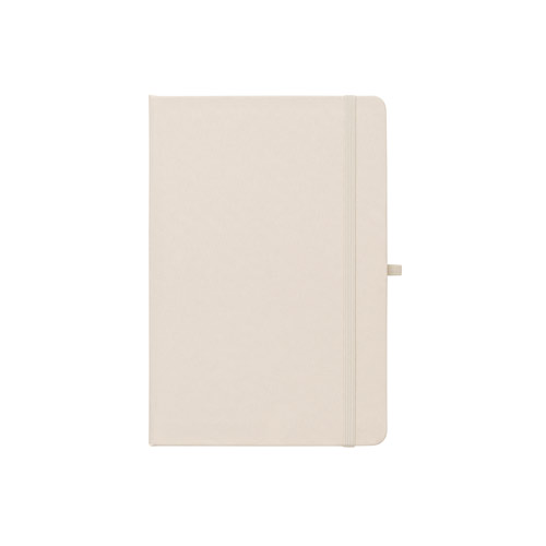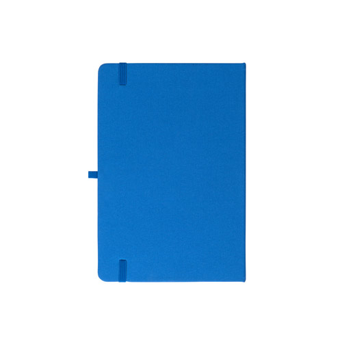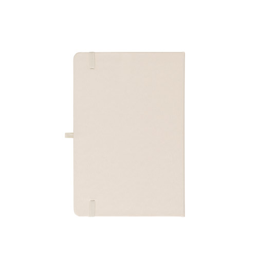 Cahier A5, à couverture rigide en polyester recyclé (100% rPET) 300D et coins arrondis. Avec 160 pages lignées en papier ivoire 100% recyclé, une bande de séparation, un porte-stylo( stylo non inclu) et un élastique de fermeture. Le symbole rPET est imprimé en blanc au bas du dos. 143 x 211 mm