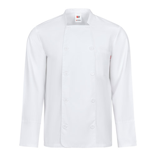 Veste de cuisine à manches longues (175g/m²) en coton (35%) et polyester (65%). Avec système de fermeture à double bouton, ouverture aux poignets et 1 poche poitrine. Taille: 44, 46, 48, 50, 52, 54, 56, 58, 60, 62, 64